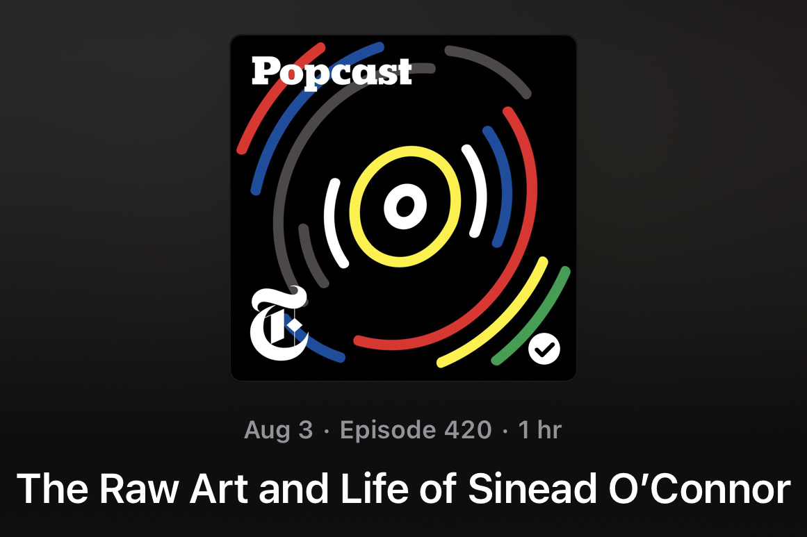 If, like me until yesterday, the only Sinéad O’Connor song you know is “Nothing Compares 2 U,” you need this starter pack as much as I did. (And, by the way, turns out “Nothing Compares 2 U” is Ms. O’Connor’s cover of a Prince song!) Start with one or the other but inhale them both: Apple Music’s Sinéad O’Connor Essentials Playlist and The New York Times’ August 3rd Popcast episode, “The Raw Art and Life of Sinéad O’Connor.” The former will have you floating in the gorgeous aquarium that is Sinéad O’Connor’s war-cry-of-a-voice and the at-times-orchestral/other-times-pop/rock/r&b productions that accompany her heart-piercing voice. The latter, under the tutelage of Honorary Professor Jon Caramanica with his expert guests Amanda Hess and Alfred Soto, will give you the 101 on the cultural significance of Ms. O’Connor’s wide-ranging work and her offbeat path to becoming a pop rock icon.